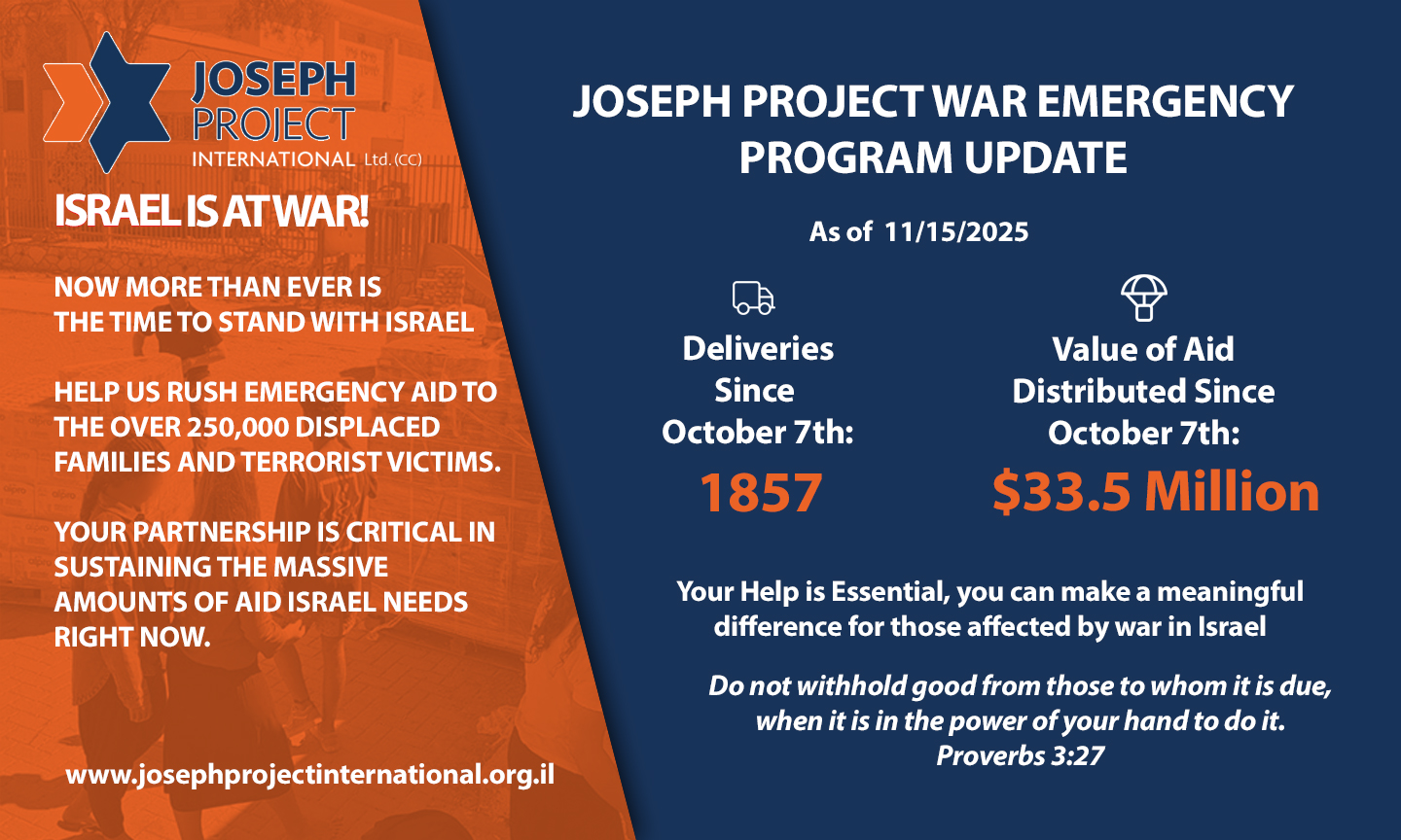 As of November 15, 2025, The Joseph Project International has distributed an astounding $33.5 million USD in humanitarian aid across Israel through 1,857 deliveries since October 7, 2023.
